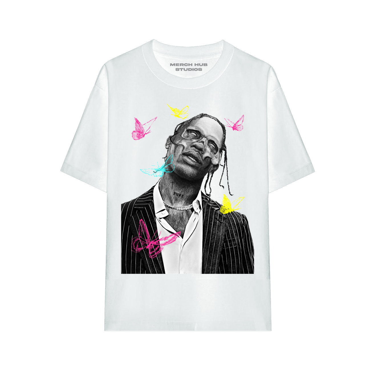 This Travis Scott Tee features a flat hem line and an extended shoulder seam for a relaxed, dropped shoulder fit, constructed from a washed cotton fabric, and finished with an updated fit.